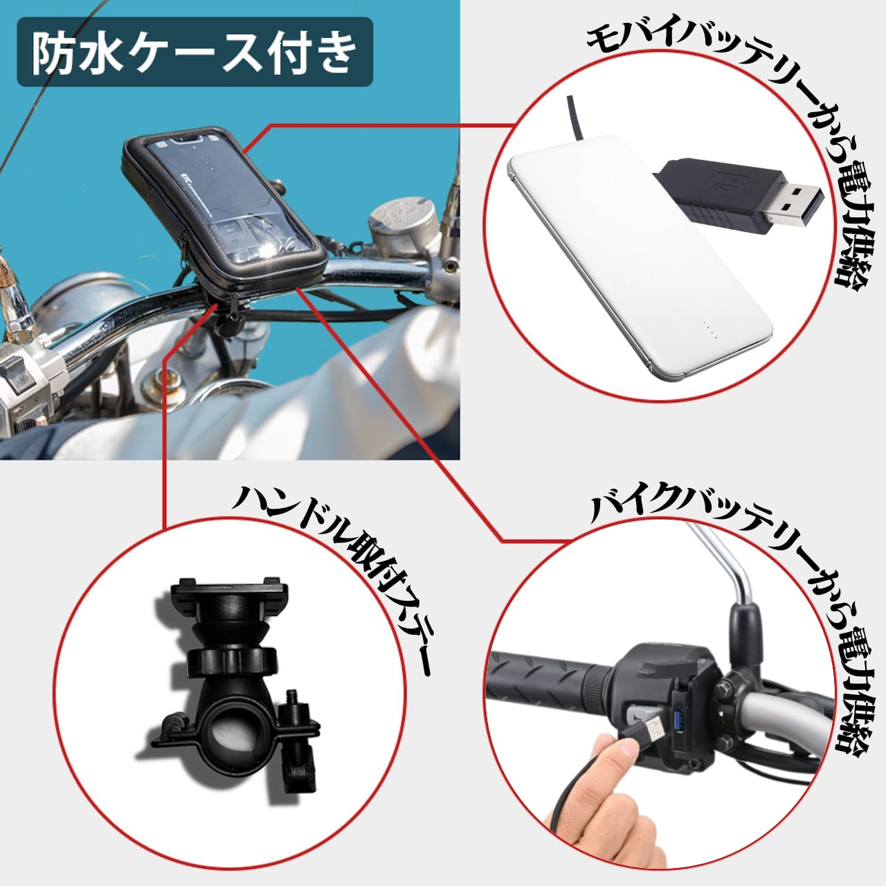 ・USBタイプA接続可能なモバイルバッテリー、またはバイクUSBコネクタ