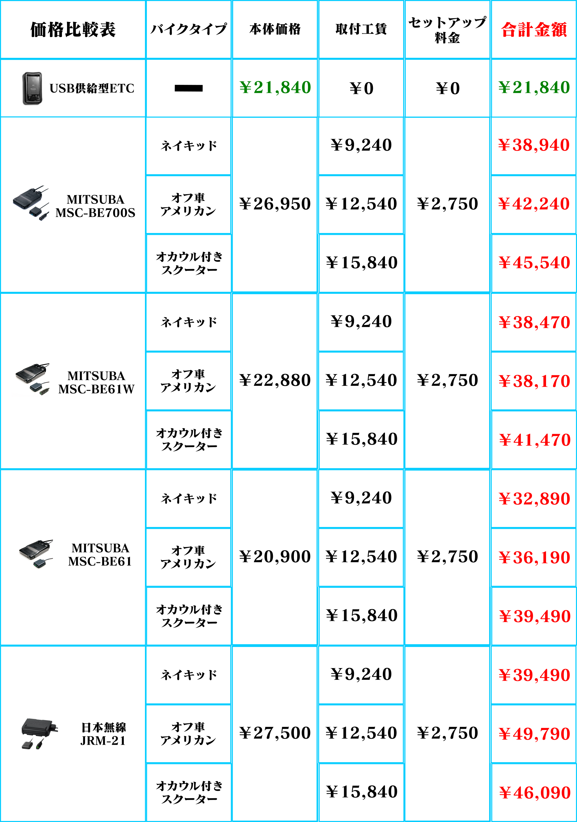 【ETCの金額比較表】